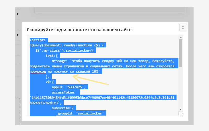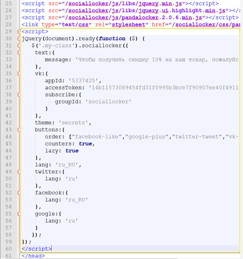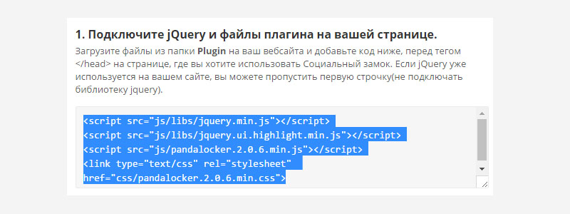 - Возвращаемся в конструктор социального замка и копируем код подключения файлов плагина.