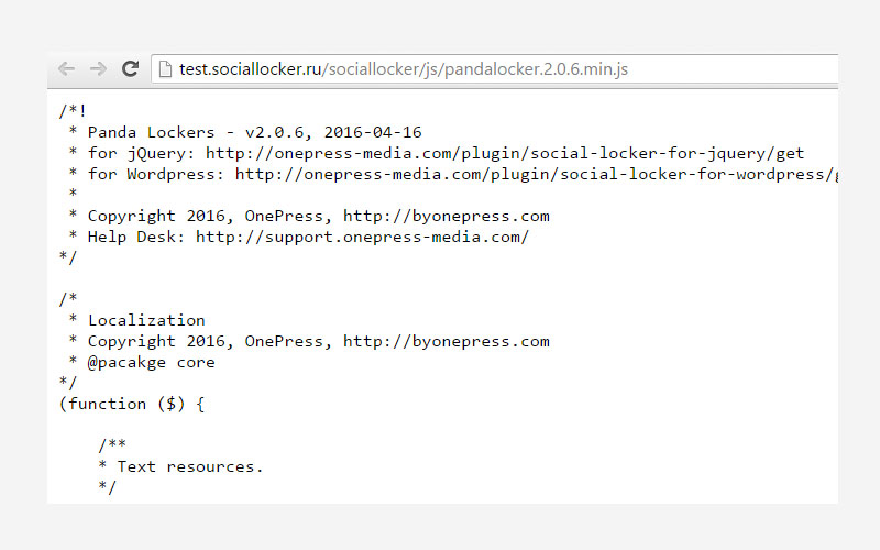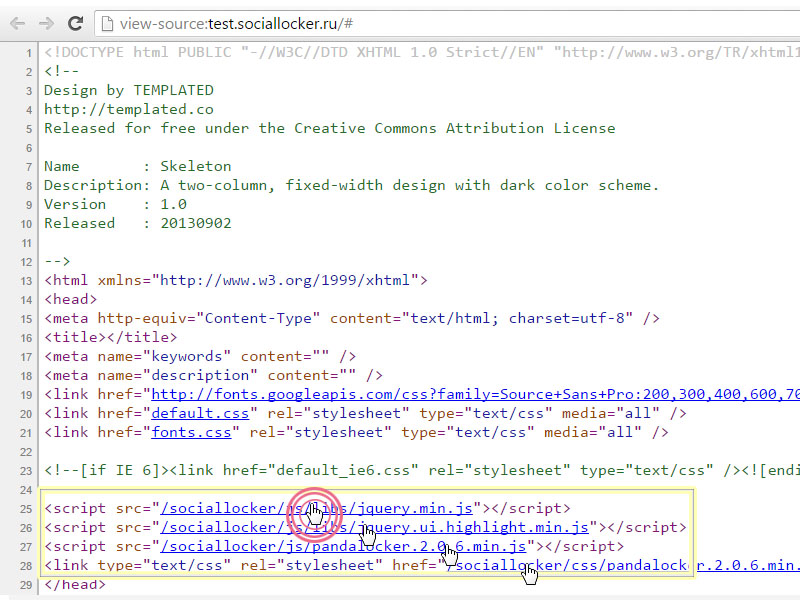 - Найдите в открытом коде страницы ваш код подключения плагина и нажимайте поочередно на ссылки.