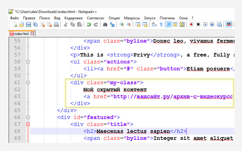<div class="my-class"> Мой скрытый контент <a href="http://вашсайт.ру/архив-с-видеокурсом.рар">Скачать мой видео-курс</a> </div> - На нашем примере открываем файл index.html в редакторе и вставляем наш Html блок в то место, где мы хотим, чтобы отображался социальный замок и скрытый контент.